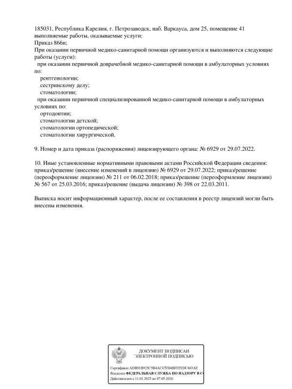 Номенклатура работ и услуг: При оказании первичной медико-санитарной помощи организуются и выполняются следующие работы (услуги): при оказании первичной доврачебной медико-санитарной помощи в амбулаторных условиях по: рентгенологии; сестринскому делу; стоматологии; при оказании первичной специализированной медико-санитарной помощи в амбулаторных условиях по: ортодонтии; стоматологии детской; стоматологии ортопедической; стоматологии хирургической.